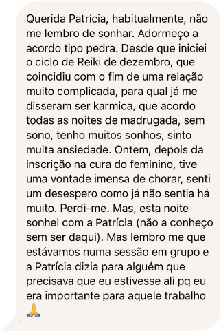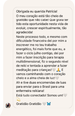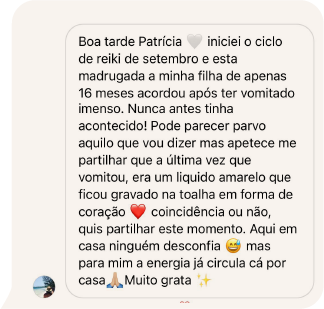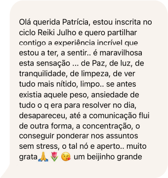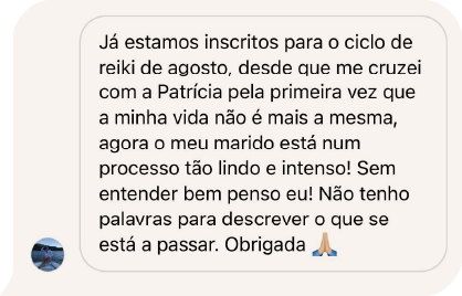 A minha conexão a este campo e egrégora que é o Reiki acontece desde os meus 15 (quinze) anos de idade. Prática, disciplina, experiência nos multiplos momentos da vida e acima de tudo rendição ao fluxo desta energia vital, inteligente e universal que permitiu-me hoje com muita facilidade domar qualquer outro tipo de energia. Ao longo da vida passei por diversos mestres Reiki tendo encontrado uma linhagem que aprecio muito na linhagem independente onde tenho hoje a 9º posição de transmissão de ensinamentos diretamente do Dr. Mikao Usui. Algo que procurei e fui guiada a receber precisamente para beleza da pureza de transmissão dos conhecimentos daqueles que tão mais perto da linhagem original chegaram. O que difere em qualquer trabalho ou envio de energia não é a técnica ou a forma de a trazer, é e será sempre a qualidade do canal de quem a canaliza como veículo.